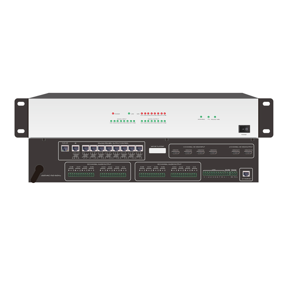 10路中控接口,8路音頻輸入8路音頻輸出,4路視頻輸入2路視頻輸出。